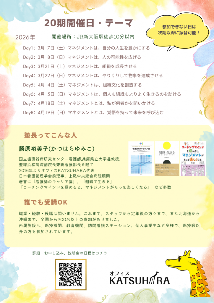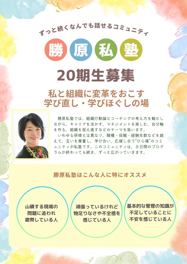 勝原私塾20期生の募集開始。 投稿者: katsuhara | 2026年1月7日 0件のコメント あけましておめでとうございます。今年の12月でオフィスKATSUHARAも丸10年になります。そして、次期の私塾は20期生を迎えるという、節目の年が幕開けしました。ここまで来れたのも、みなさんに応援してもらったおかげだと、深く感謝しております。さて、20期は3月に開講します。チラシができましたので、御覧ください。併せて、説明会の日程は、次の投稿でお知らせしますので、興味があるよーという方はぜひご確認くださいね。