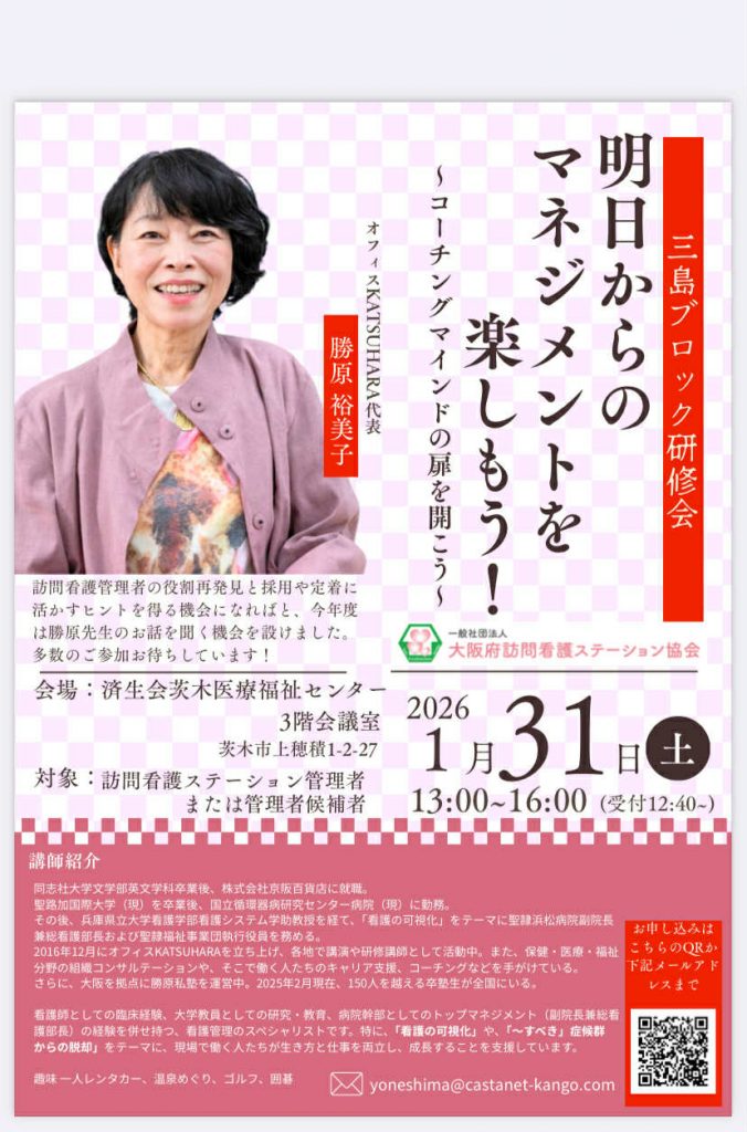 訪問看護におけるコーチング 投稿者: katsuhara | 2026年1月31日 0件のコメント 3時間だけど、がっつりコーチングマインド研修。私の看護師新人時代の同期も来てくれていて、再会をハグして喜んだ😊 むちゃくちゃ盛り上がって、明日から活かせそうとの声がいっぱい。 「ねばならない症候群」を手放した先にはいい感じの未来が待ってるよ。